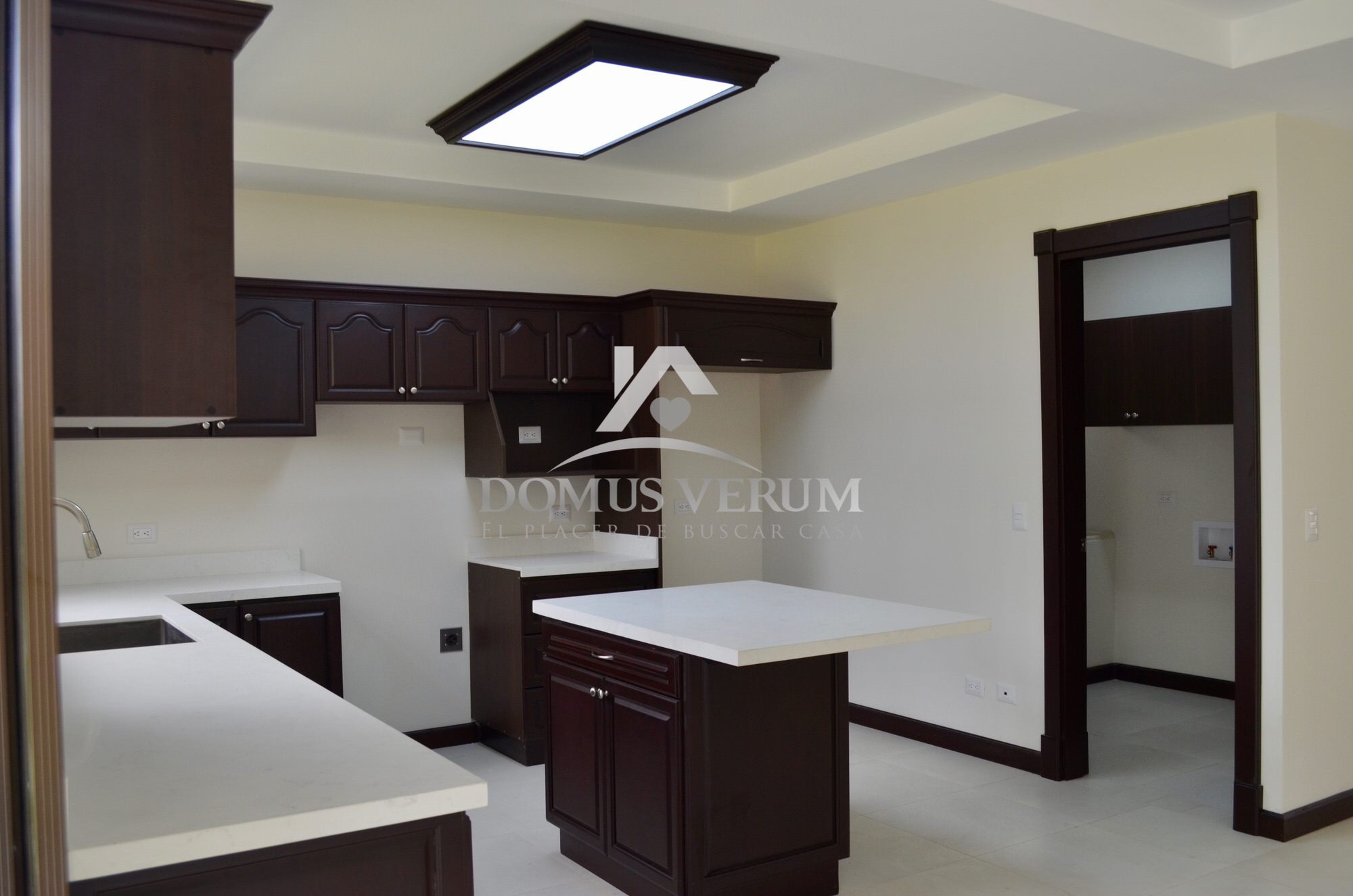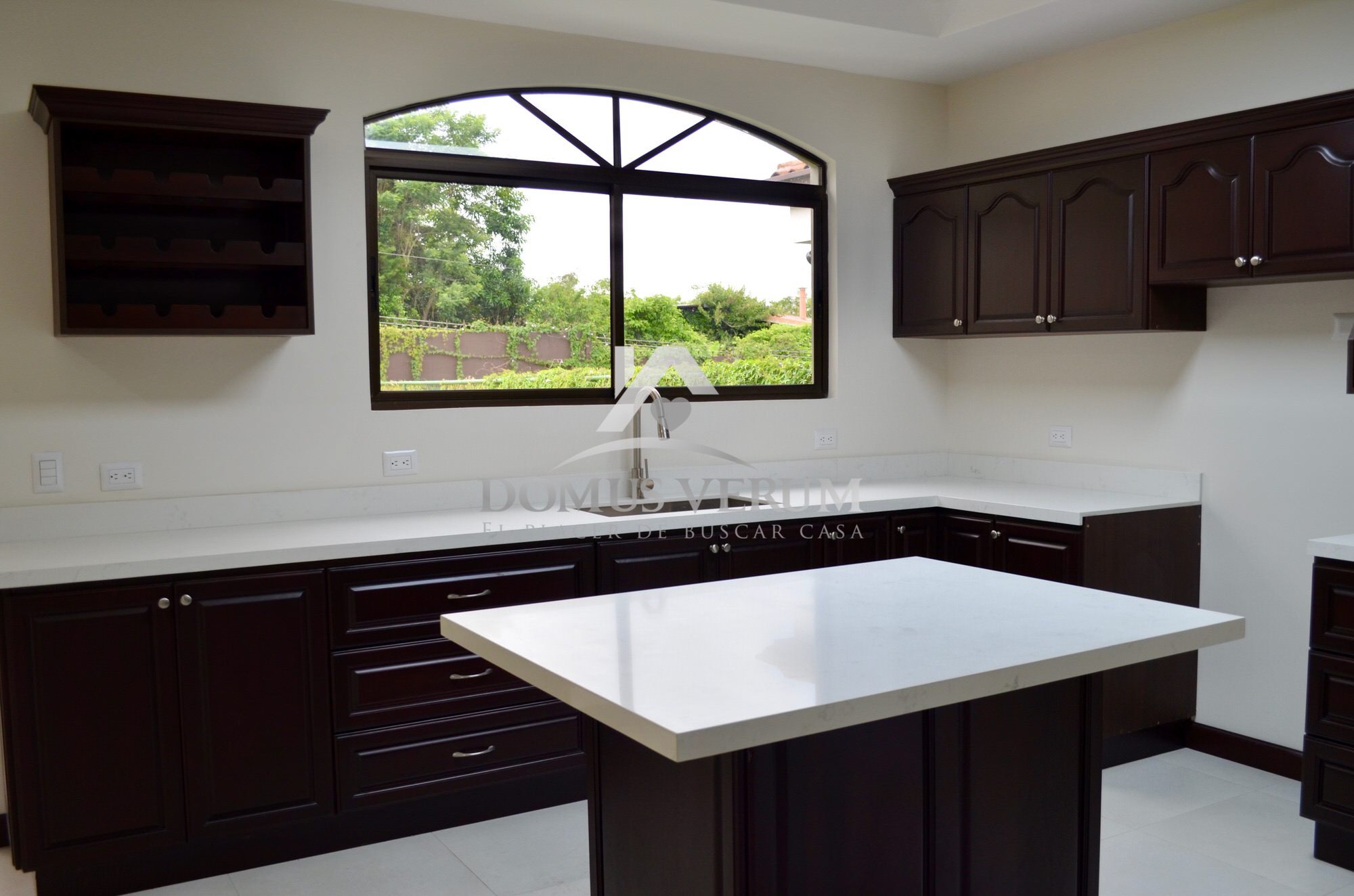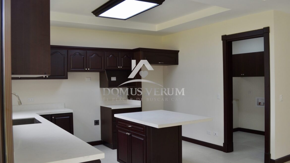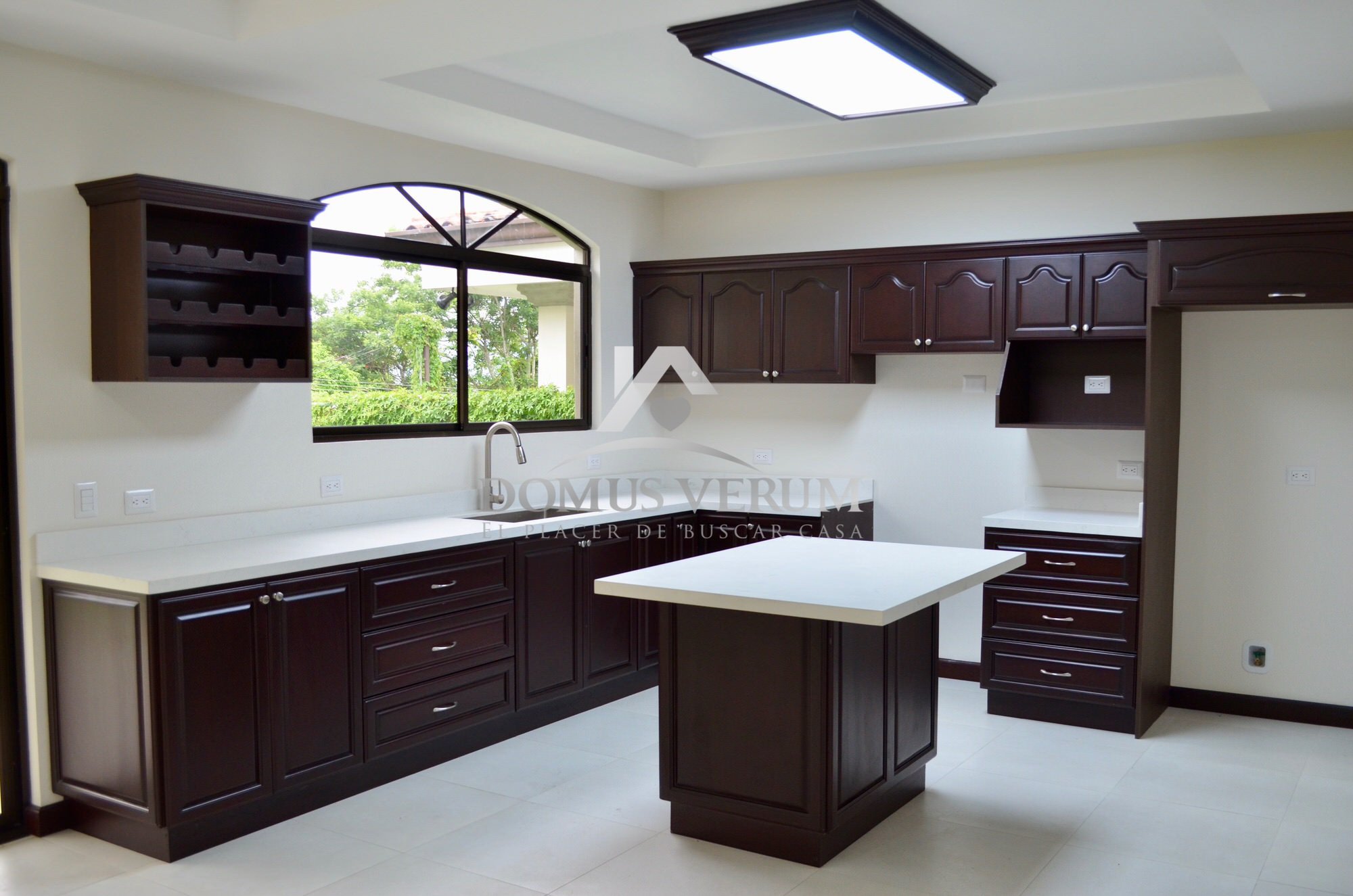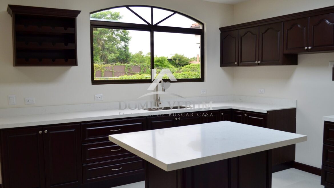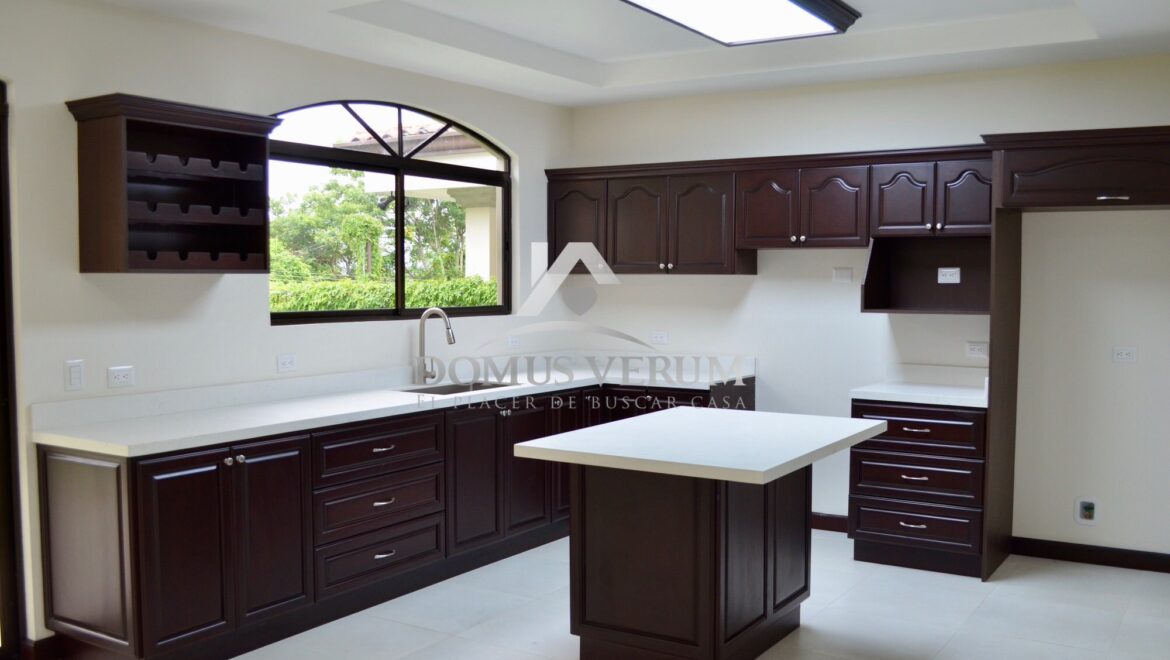 – Cocina con muebles en madera de laurel, top en cuarzo blanco, isla en el centro.