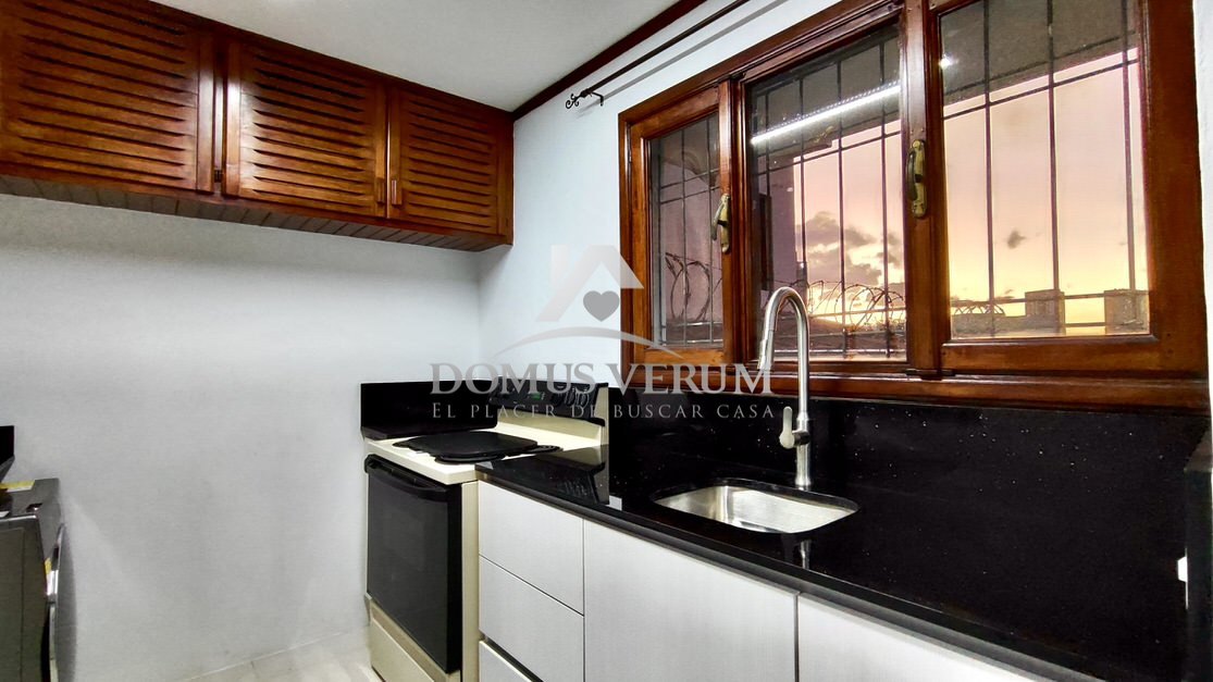 Cocina totalmente equipada con refrigerador, microondas y un práctico lavaseca integrado.