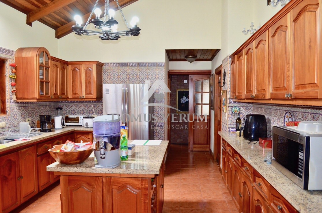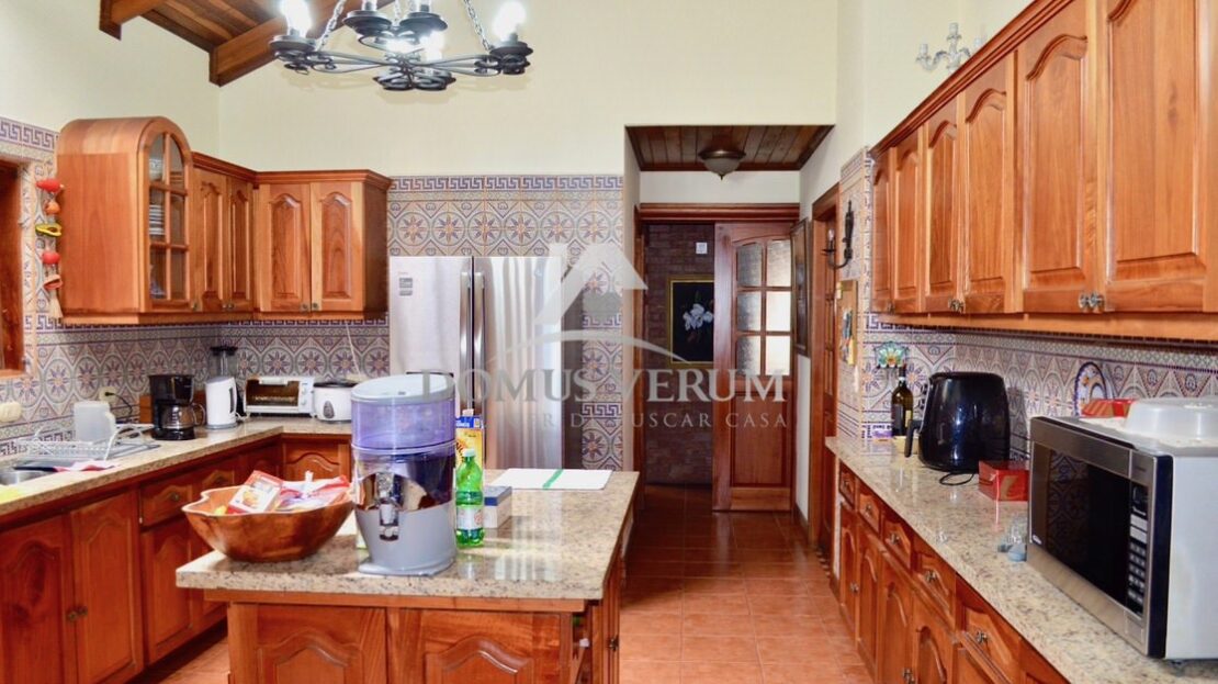La cocina cuenta con muebles en madera, sobre en granito, es espaciosa y con mucha luz.